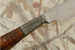 The curly maple handle fits perfectly to the integral bolster. A black fiber spacer between the bolster and handle assists the knife to adjust to temperature and humidity changes.