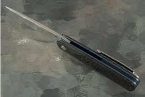 The scales are formed from silver strike carbon fiber. This variation of lightning strike carbon fiber has silver toned wire woven through the carbon threads. Zirconium bolsters meet perfectly to the scales. Zirconium is a transitional metal that is primarily mined in South Africa and Australia. It is highly resistant to corrosion and scuffing. The thin-profiled handle is compact enough to keep in the pocket and never notice it until it is needed. The deep carry titanium pocket clip is mounted for right-handed, tip-up carry.