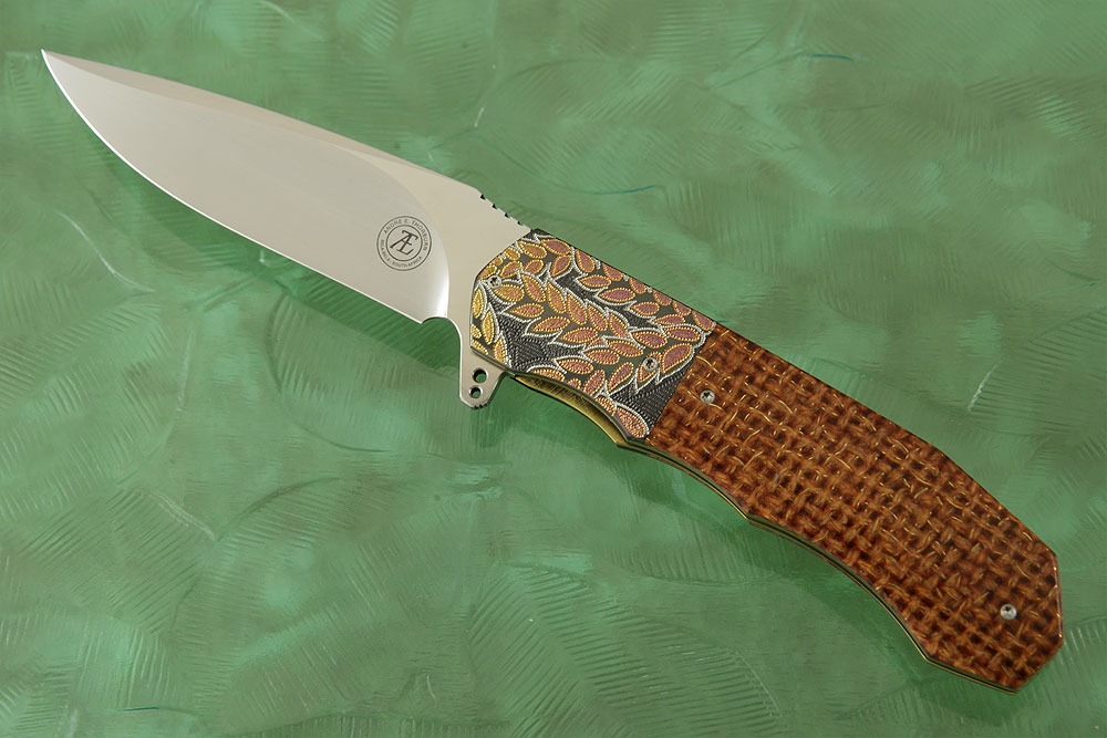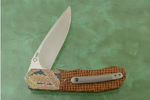 Zirconium bolsters are hand engraved, textured, and differentially anodized by Marietjie Thorburn, ensuring a positive grip. Zirconium is a transitional metal that is primarily mined in South Africa and Australia. It is highly resistant to corrosion and scuffing. Fileworked titanium liners are bronze anodized and surround a G10 backbar. The 3D machined titanium pocketclip with ceramic retention ball is mounted for right-handed, tip-up carry.
