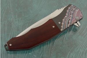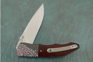 The scales are formed from burgundy Micarta. Jimping on the thumb ramp provides a comfortable, secure grip. The gently rounded handle feels sturdy and fills out the hand perfectly. This combination nicely complements anodized and engraved zirconium bolsters. The bolsters have an elegant iridescence that is quite captivating. Zirconium is a transitional metal that is primarily mined in South Africa and Australia. It is resistant to scuffing and corrosion. The handle is completed with anodized titanium liners and a 3D machined titanium pocket clip with ceramic ball mounted for right-handed, tip-up carry.