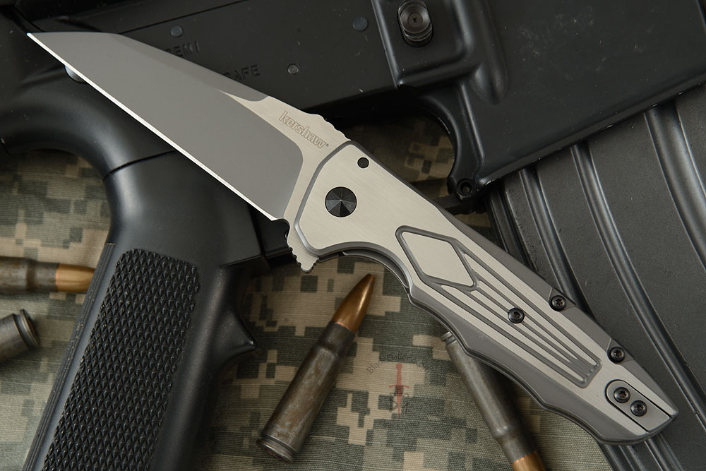 The 8Cr13MoV blade is a modified Wharncliffe with a top swedge. The handles are two-tone-finished steel with cold-forged handle texture for a solid grip. A strong framelock secures the blade open during use. Kershaw also added a decorative glass-filled nylon backspacer in matte black and a moveable steel filler tab so the look is nicely detailed and neatly finished. The pocketclip is Kershaw’s deep-carry pocketclip so that the knife rides comfortably low and unobtrusively in your pocket.