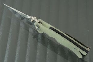 Jade TurboGlow scales are precision 3D machined for a sure, comfortable grip. The composite handle glows in the dark!! The scales surround a black G-10 back spacer. The deep carry titanium pocket clip is mounted for right-side, tip-up carry. Dual titanium thumb studs make for easy right- or left-handed opening -- though you'll likely open the knife using the ambidextrous flipper mechanism. The blade is closed with a right-handed button lock. Piercing at the back of the handle allows for the easy addition of a lanyard.