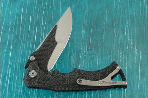 Carbon fiber scales are precision 3D machined for a sure, comfortable grip. The scales surround a black G10 backbar that will accommodate a lanyard. The titanium pocket clip with ceramic retention ball is mounted for tip-up, right-handed carry.