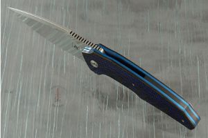 The scales are formed from carbon fiber, meticulously inlaid with deep blue C-Tek. C-Tek is a material that has been "in the works" since 1995. The material is absolutely stunning in its appearance and its ability to reflect light and gives a whole new depth to the knife making art. Jimping on the thumb ramp aids grip. The gently rounded handle feels sturdy and fills out the hand perfectly. It is completed with blue anodized titanium liners. The ultra-light machined titanium pocket clip with ceramic ball is mounted for tip-up, right handed carry.
