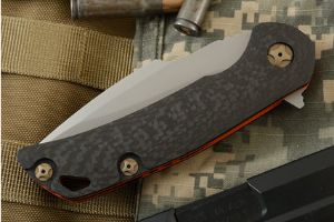 The handle is formed from carbon fiber with orange G-10 accents. So as to keep this knife light, yet strong, Gr6 titanium liners are inlaid into the scales. The free-floating backspacer is formed from black G-10. The handle is completed with a machined, black G-10 pocket clip.