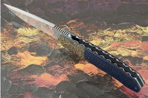The scales are formed from blue lightning strike carbon fiber. Bronze wires are woven throughout the carbon fiber strands. Jimping on the thumb ramp provides a comfortable, secure grip. The gently rounded handle feels sturdy and fills out the hand perfectly.