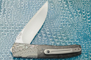 Zirconium bolsters are hand engraved, textured, and heat colored by Marietjie Thorburn, ensuring an elegant positive grip. Zirconium is a transitional metal that is primarily mined in South Africa and Australia. It is resistant to corrosion and scuffing. Fileworked titanium liners are anodized blue. The liners surround a black G10 backbar. The 3D machined titanium pocket clip with ceramic retention ball is mounted for right-side, tip-up carry.