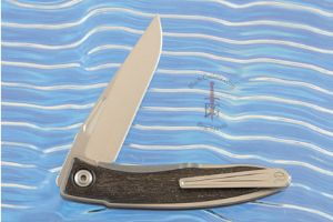 This Mnandi features bog oak set into the titanium frame. This wood has been buried in a Nordic peat bog for hundreds or sometimes thousands of years. The extremely low oxygen conditions of the bog protect the wood from normal decay, while the underlying peat provides acidic conditions where iron salts and other minerals react with the tannins in the wood, gradually giving it a distinct dark brown to almost black color. The wood is inlaid into the frame rather than being simple overlays. The blade is made from Crucible S35VN steel, hardened to 58-59 Rc for strength and keen edge retention.