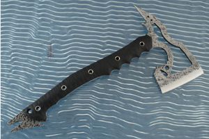 Description: This tactical hawk was hand forged by Black Dragon Forge, led by South African knifemaker Neels van den Berg. Neels is a full-time bladesmith and knifemaker with a passion for learning and teaching. After taking a knifemaking course in 2007, van den Berg knew he had stumbled upon his passion. Neels forges his own steel and strives to make practical, high-quality, no-nonsense knives and tools. He expects his knives to be used and used hard.
