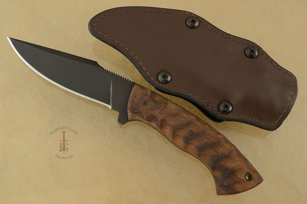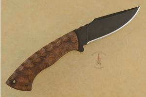 The blade is formed from high performing 80CrV2 carbon steel with a non-glare Caswell finish. A full tang ensures strength and durability while an aggressive distal taper provides perfect balance. Jimping along the spine and contoured handle scales provide plenty of traction in a variety of grip options. The hand sculpted walnut wood handle provides a particularly secure grip. A lanyard hole allows for the easy addition of paracord for extra retention in hand.