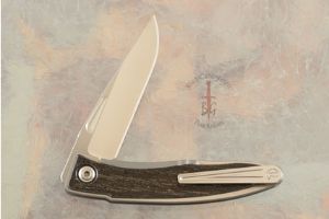 This Mnandi features bog oak set into the titanium frame. This wood has been buried in a Nordic peat bog for hundreds or sometimes thousands of years. The extremely low oxygen conditions of the bog protect the wood from normal decay, while the underlying peat provides acidic conditions where iron salts and other minerals react with the tannins in the wood, gradually giving it a distinct dark brown to almost black color. The wood is inlaid into the frame rather than being simple overlays. The blade is made from Crucible S35VN steel, hardened to 58-59 Rc for strength and keen edge retention.