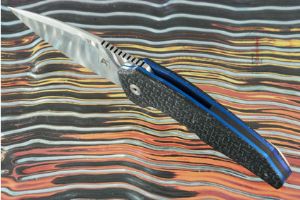 Handle scales are formed from silver strike carbon fiber. Silver toned wires travel through the carbon fiber weave. Jimping on the thumb ramp aids grip. The gently rounded handle feels sturdy and fills out the hand perfectly. The handle is completed with blue anodized titanium liners. The ultra-light titanium pocket clip is mounted for tip-up, right-handed carry.