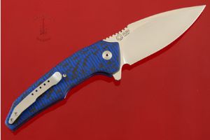 Handle scales are formed from blue/black carbon fiber. Jimping on the thumb ramp aids grip. The gently rounded handle feels sturdy and fills out the hand perfectly. It is completed with bronze anodized titanium liners. The ultra-light titanium pocket clip is mounted for tip-up, right-handed carry.