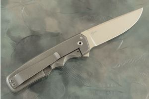 A natural linen Micarta scale is set on a stonewashed titanium frame. A sturdy framelock provides a consistently strong lockup. The bolster is made from Timascus (titanium damascus). The low profile stonewashed titanium pocket clip is mounted for right handed, tip-up carry.