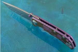 The Spartan Harsey Folder is a reliable frame lock knife, that with the exception of the pivot, blade, and stop pin is totally made of 6AL-4V titanium -- keeping the knife strong yet light. Jimping along the spine and a large cutout offer an exceptionally secure grip. This special Harsey Folder's handle was anodized purple and bronze and laser engraved with a Kraken attacking a sailing ship. This folder has a reversible pocket clip and dual thumb studs to accommodate left-handed users. A clip insert covers the clip location not being used.