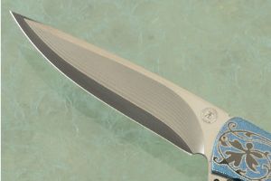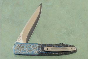 Zirconium bolsters are hand engraved, textured, and anodized by Marietjie Thorburn, ensuring a positive grip. Zirconium is a transitional metal that is primarily mined in South Africa and Australia. It is highly resistant to corrosion and scuffing. Fileworked titanium liners are anodized blue on the flats and bronze in the bevels and surround a black G10 backbar. The 3D machined titanium pocket clip with ceramic retention ball is mounted for right-handed, tip-up carry.