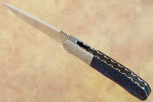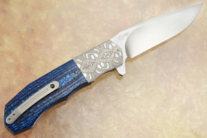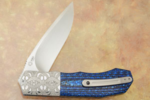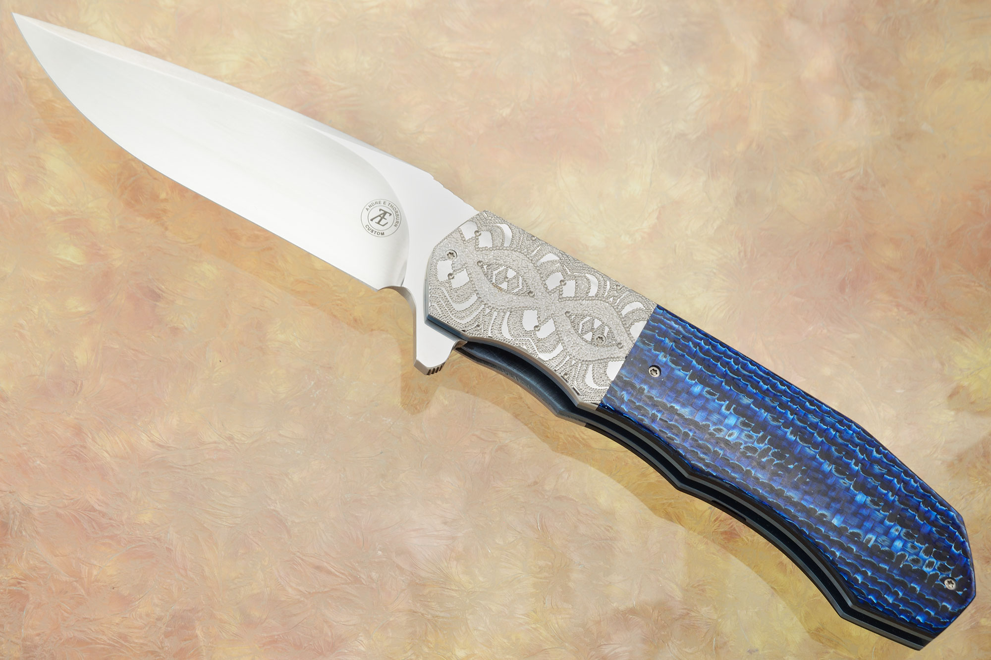 Stainless steel bolsters are hand engraved and textured by Marietjie Thorburn, ensuring an elegant, positive grip. Blue twill handle scales are nicely rounded for a secure, comfortable grip. Fileworked titanium liners are anodized blue on the flats and purple on the bevels and surround a G10 backbar. The 3D machined titanium pocket clip with ceramic retention ball is mounted for right-handed, tip-up carry.