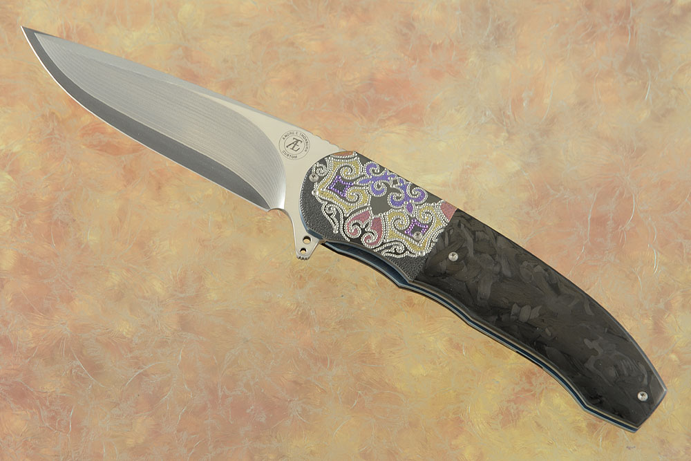 Zirconium bolsters are hand engraved, textured, and anodized by Marietjie Thorburn, ensuring a positive grip. Zirconium is a transitional metal that is primarily mined in South Africa and Australia. It is highly resistant to corrosion and scuffing. Fileworked titanium liners are anodized blue on the flats and purple in the bevels and surround a black G10 backbar. The 3D machined titanium pocket clip with ceramic retention ball is mounted for right-handed, tip-up carry.
