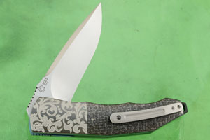 Handle scales are formed from silver strike carbon fiber. Aluminum wires travel through the carbon strands in this variation on lightning strike carbon fiber. Jimping on the thumb ramp provides a comfortable, secure grip. The gently rounded handle feels sturdy and fills your hand perfectly.