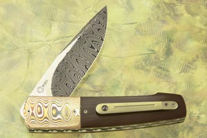 The scales are made from burgundy linen Micarta, They meet seamlessly with bolsters formed from Chad Nichol mokume gane. The three tone mokume nicely complements the undulating steel in the blade. Anodized titanium liners surround a matching damascus backbar. The anodized 3D machined titanium pocket clip with ceramic retention ball is mounted for right-handed, tip-up carry.