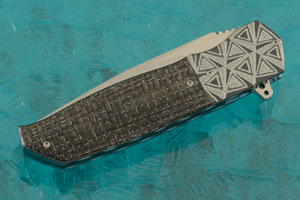 The scales are formed from silver strike carbon fiber. Silver toned wires are woven through the carbon fiber weave in the exciting variation of lightning strike carbon fiber. Jimping on the thumb ramp provides a comfortable, secure grip. The gently rounded handle feels sturdy and fills out the hand perfectly. This combination nicely complements the anodized and engraved zirconium bolsters. The bolsters have an elegant iridescence that is captivating. Zirconium is a transitional metal that is primarily mined in South Africa and Australia. It is highly resistant to corrosion and scuffing. The handle is completed with blue anodized titanium liners that surround a black G10 backbar. The 3D machined titanium pocket clip with ceramic retention ball is mounted for right-handed, tip-up carry.