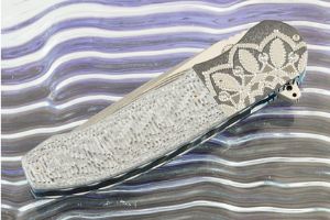 Description: South African knifemaker André Thorburn creates an exceptional folder. The blade is perfectly centered with silky-smooth action. The flipper opening is tremendously easy to use for quick deployment. When combined with the IKBS ball bearing system, the action is exceptional! The Ikoma Korth Bearing System (IKBS) was originally designed to fit balisong knives and uses ball bearings to create exceptional action with no blade play. This special folder is made with ceramic ball bearings. Generally IKBS bearings are made either from tool steel or from stainless steel. Stainless steel can wear away, resulting in uneven action over time. Tool steel bearings can oxidize making the action rough. Ceramic bearings are the best of all worlds -- extremely hard and wear resistant, they are also inert and will not oxidize. Andre is a master of the IKBS pivot and the action is as smooth as a knife gets!