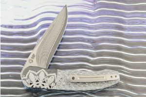 The blade is formed from stainless damascus san mai. A central bar of Takefu SG2 powdered metallurgical stainless steel is surrounded by alternating layers of stainless steel and nickel. At Hrc 63-64, this folder has among the best edge holding of any Thorburn knife ever made. The resulting damascus is high contrast and immediately captivating. The linear damascus reveals Andre's complex, super-clean grind. The flats are mirror polished, nearly hiding the pattern. The blade is hollow ground for an easy to maintain edge.