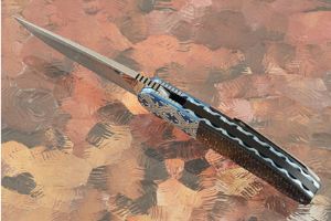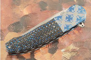 The scales are blue/silver carbon fiber that has been nicely domed and polished. Jimping on the thumb ramp provides a comfortable, secure grip. The gently rounded handle feels sturdy and fills out the hand perfectly.