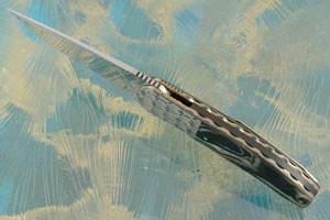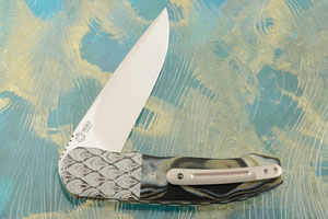 The scales are formed from camouflage G10. Jimping on the thumb ramp provides a comfortable, secure grip. The gently rounded handle feels sturdy and fills out the hand perfectly. This combination nicely complements the anodized and engraved zirconium bolsters. The bolsters have an elegant iridescence that is captivating. Zirconium is a transitional metal that is primarily mined in South Africa and Australia. It is highly resistant to corrosion and scuffing. The handle is completed with bronze anodized titanium liners with fileworked bevels. The 3D machined titanium pocket clip with ceramic retention ball is mounted for right-handed, tip-up carry.