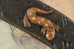 A unique knife at sight, the handle is made from textured, antiqued mild steel. The left scale features a detailed gecko inlaid in copper with 24k gold and silver details. The right scale features a detailed image of bamboo formed from copper that has been contoured and engraved. Bamboo is a favorite hiding spot for geckos. The steel scales are set on 308 stainless steel liners.
