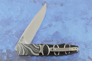 The scales are formed from Dichrolam chatoyant carbon fiber. This unique new material is strong and sturdy while providing a chatoyancy similar to tiger's eye gemstones! Jimping on the thumb ramp provides a comfortable, secure grip. The gently rounded handle feels sturdy and fills out the hand perfectly.