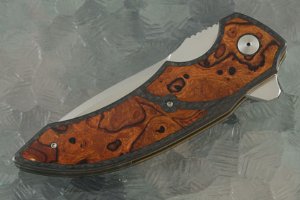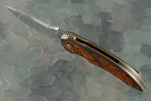 The scales are formed from carbon fiber, meticulously inlaid with presentation grade ironwood. Jimping on the thumb ramp aids grip. The gently rounded handle feels sturdy and fills out the hand perfectly. It is completed with bronze anodized titanium liners. The 3D machined zirconium pocket clip is mounted for tip-up, right handed carry.