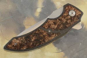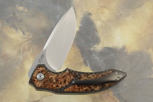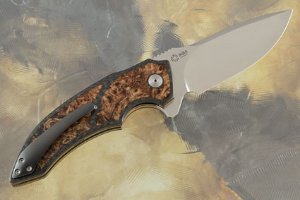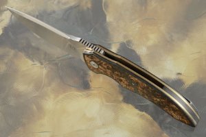 The scales are formed from carbon fiber, meticulously inlaid with presentation grade spalted maple burl. Jimping on the thumb ramp aids grip. The gently rounded handle feels sturdy and fills out the hand perfectly. It is completed with bronze anodized titanium liners. The 3D machined zirconium pocket clip is mounted for tip-up, right handed carry.