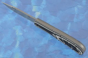 The handle is made from layered black and grey G10 set on bead blasted titanium liners. Contouring on the handle provides a secure, comfortable grip. Everything is held together with titanium torx hardware.
