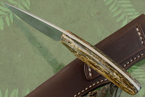 The handle is made from stabilized kudu horn set to the tang using five stainless steel pins. The material is taken from the inside of the kudu horn and has been highly polished -- combining a dramatic appearance with durability. The knife is very lightweight (just 1.8 oz!) and comfortable to hold, making it perfect for a daily carry fixed blade.
