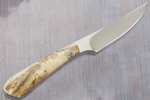 Warthog tusk handle scales are set to the full tang using stainless steel pins. The knife is very lightweight (just 2 oz!) and comfortable to hold, making it perfect for a daily carry fixed blade. From caping to fowl and finish, this bird & trout knife will be a tremendous piece out in the field.