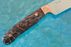 Copper bolsters meet perfectly with Voodoo Resin scales. Each bolster is carved with a detailed rose. Voodoo Resin is the latest in modern knife and gun handle material. The unique, highly exotic scales are a mosaic composition of corrugated honeycomb aluminum with super-strong pearlescent resin. Copper hidden bolt rivets reflect tones in the bolsters.