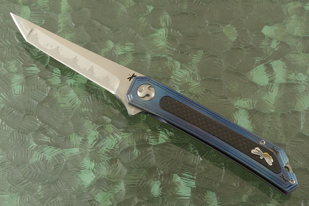 At 4.2 oz, the Flipping Tanto is light weight and fast. The anodized titanium frame surrounds a laser engraved titanium partial backstrap. Carbon fiber is meticulously inlaid into the frame. A silver butterfly is set on the carbon fiber. The sturdy titanium lock has an adjustable face lock for if the lock face ever wears. The titanium pocket clip is mounted for right-handed, tip-up carry. Laser engraved butterflies are set throughout the back frame and pocket clip.