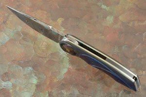 The scales are formed from heat colored zirconium. This was inlaid with textured and anodized titanium. This, in turn was inlaid with polished titanium damascus. A tiered pivot collar combines contoured zirconium with terraced zirconium/titanium damascus. Bronze anodized titanium liners surround a zirconium back spacer. The 3D machined, anodized stainless damascus pocket clip is mounted for right-handed, tip-up carry. This is a knife you will want in your collection!