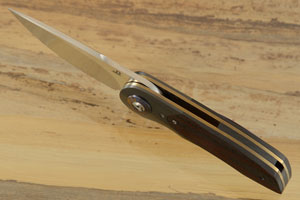 The Gold Mini was designed by Jared Van Otterloo (JVO). This smaller version of the Gold Standard has a 2-3/4 inch blade -- easily capable of getting any task done -- yet the compact size makes it tremendously carry-friendly. The blade is perfectly centered with silky smooth action -- easily opened with one hand using the discreet and ambidextrous flipper toggle. It uses the IKBS (Ikoma Korth Bearing System) pivot system. This mechanism, which was originally designed to fit balisong knives, uses ball bearings to create exceptional action with no blade play.
