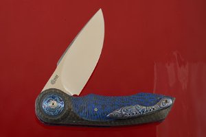 The scales are formed from 3D contoured carbon fiber meticulously inlaid with a black and blue carbon fiber. An anodized White Timascus titanium damascus pivot ring is inlaid to add flash. Blue anodized titanium liners surround a G10 backbar and jimping along the liner lock makes the lock particularly easy to disengage. The Timascus pocket clip is mounted for right-handed, tip-up carry.