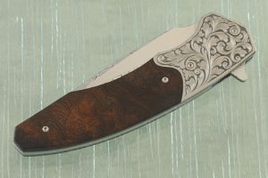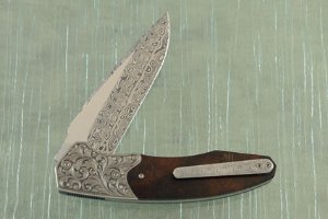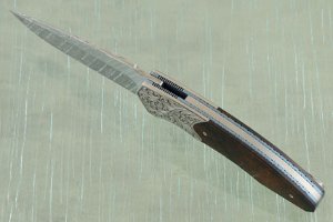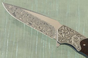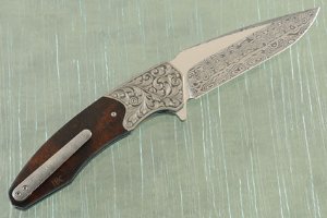 The handle is made from presentation grade Arizona desert ironwood that has been nicely domed and polished. The scales meet perfectly with titanium bolsters in a perfectly fit S-curve. The bolsters are meticulously engraved by Julien Marchal. Belgium-born artist Julien Marchal studied engraving and gun making at Léon Mignon Liège in Belgium and now lives in South Africa. The floral scroll engraving shows his tremendous attention to detail and elegant designs. Titanium liners are hand fileworked and anodized blue. Jimping along the liners provides a solid purchase. The 3D machined Damasteel pocket clip is mounted for right-handed, tip-up carry.