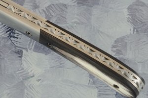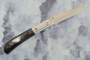 Buffalo horn scales are set on titanium liners. The scales are black with white highlights. They are perfectly dovetailed to satin finished 416 stainless steel bolsters. The backbar is fully fileworked. This slim profiled folder would feel at home in nearly any collection. Despite this, its convenience size will make it hard to keep out of your pocket.