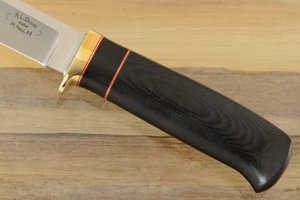 The hidden tang handle is constructed from black micarta with brass and red fiber spacers. The guard is made from polished brass. A brass end cap secures the hidden tang.