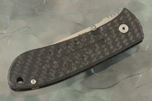 The handle is made from carbon fiber. It feels sturdy and features an inlaid sidelock. A lanyard can be added to the rear of the handle for extra retention if desired. The blue anodized titanium pocket clip is mounted for right-handed, tip-up carry.