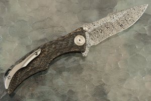 The 4 inch harpoon shaped blade is made from stainless damascus forged by Damasteel in Sweden. The high contrast pattern is immensely captivating and will provide excellent edge retention. The blade can be easily deployed using either the ambidextrous flipper tab or the dual thumb studs. The button lock makes one-handed closing a breeze.