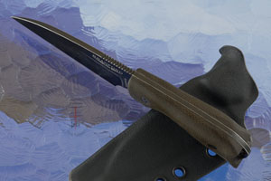 The scales are formed from olive drab green Micarta that is machined to offer a secure grip without being abrasive. Micarta scales are set on a full tang for strength and durability. The handle has been 3D machined for a perfect contoured grip.