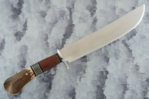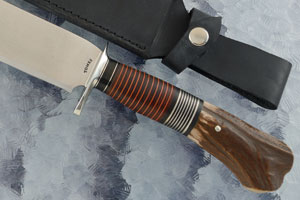 The Scagel style handle (a hallmark of Tomes' work), is exceptionally well done. It combines stacked black fiber with thinner nickel spacers and stacked leather. A polished 416 stainless steel guard stops your hand from sliding forward onto the blade. The handle is completed with a stag 'pommel' that will hold up well to hard use.