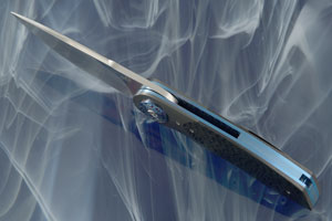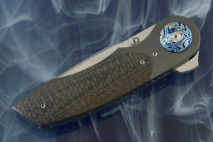 The scales are formed from carbon fiber that meets nicely with polished zirconium bolsters. Zirconium is a transitional metal that is primarily mined in South Africa and Australia. It is highly resistant to corrosion and scuffing. An oversized titanium damascus pivot ring surrounds the pivot. Titanium liners surround an anodized titanium backspacer and allow a lanyard to be added. The custom zirconium pocket clip is mounted for right-handed, tip-up carry.