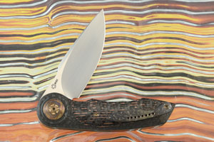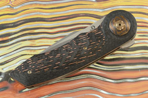 The scales are formed from carbon fiber inlaid with sections of copper wire carbon fiber. A terraced titanium damascus pivot ring adds flash. Bronze anodized titanium liners surround a carbon fiber backbar. The textured and anodized titanium pocket clip is mounted for right-handed, tip-up carry.